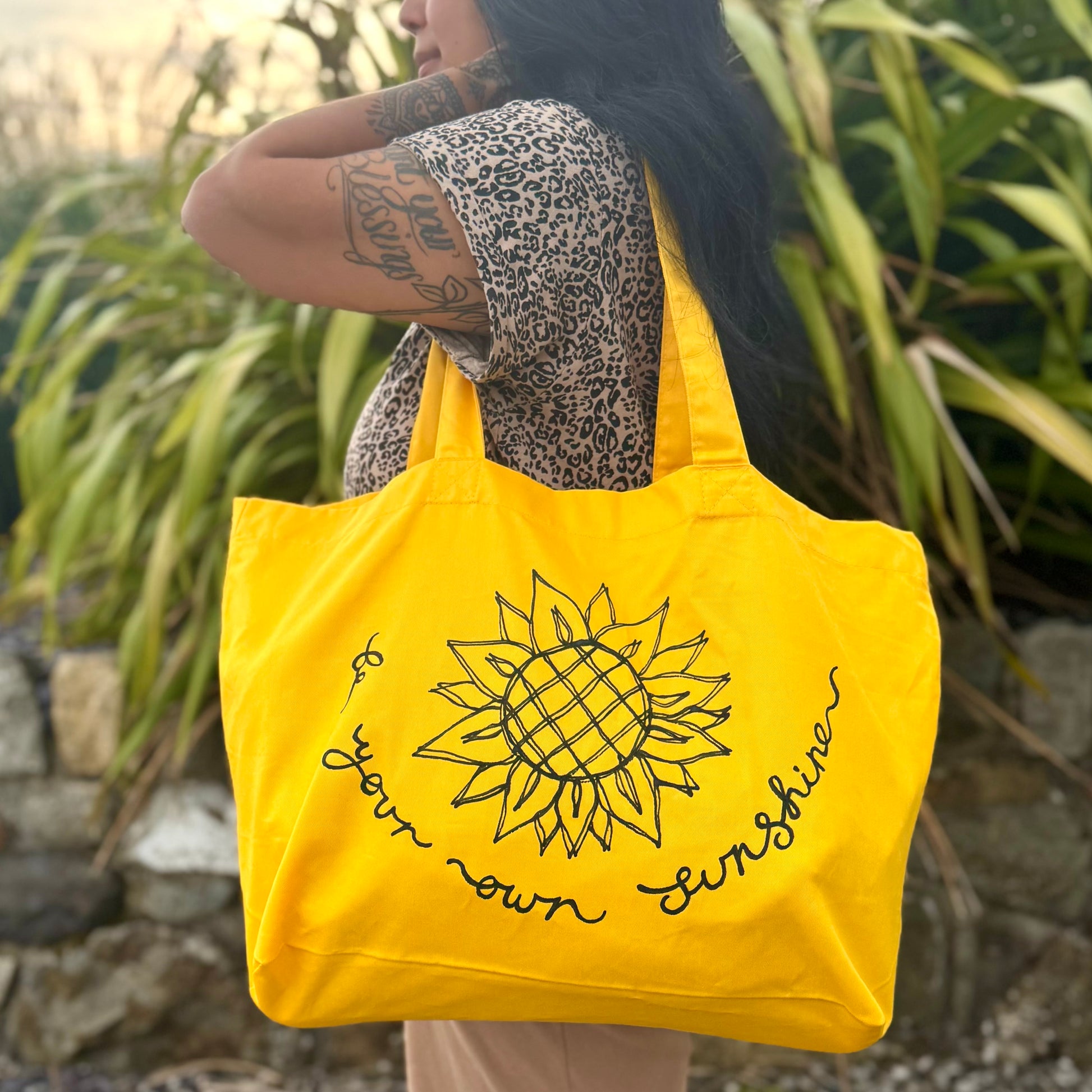 Brighten up your days with this cheerful, large yellow tote bag featuring my hand-painted “Be Your Own Sunshine” sunflower design.