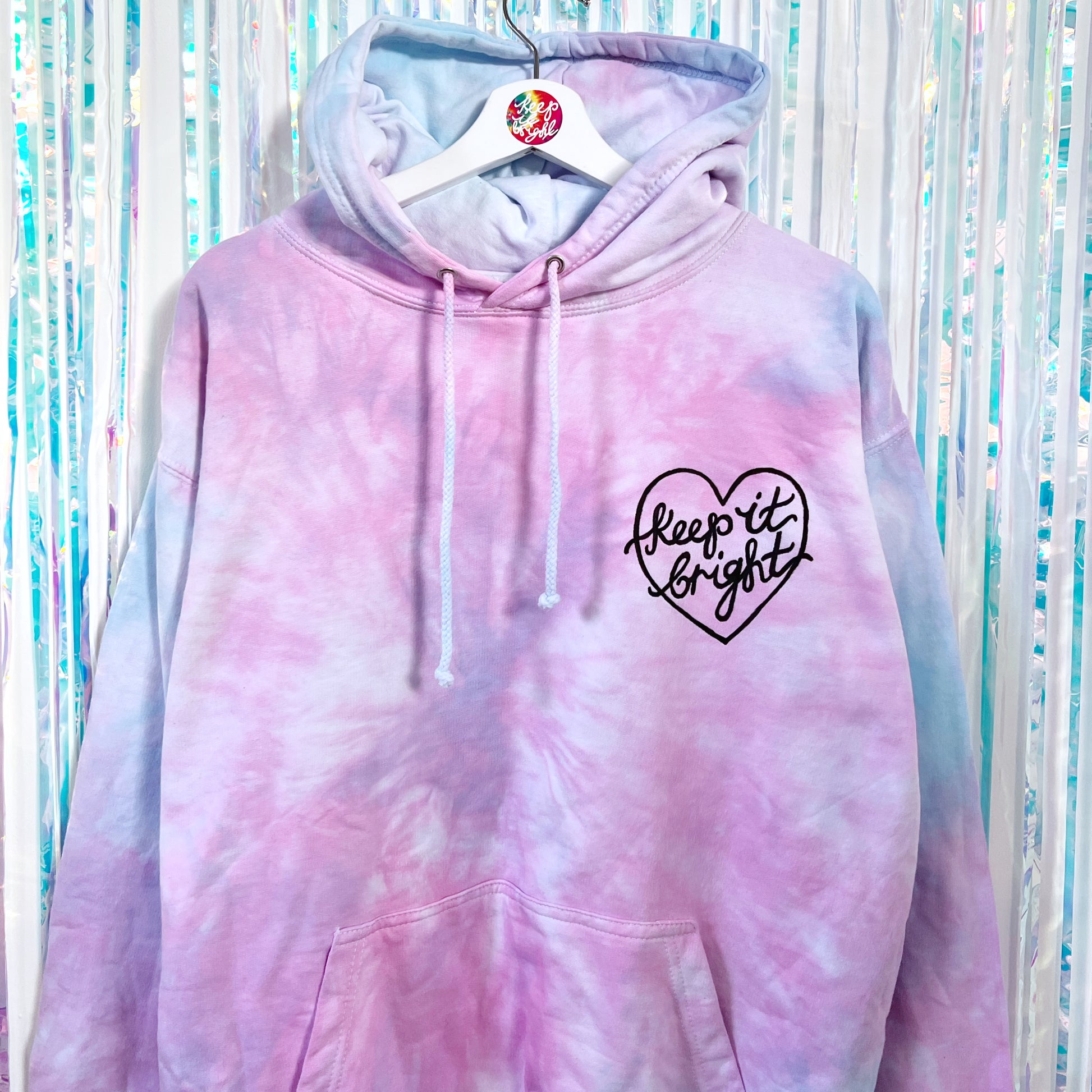 This one-of-a-kind, hand-dyed pastel tie dye hoodie features my hand-painted ‘Keep It Bright’ heart design on the chest.