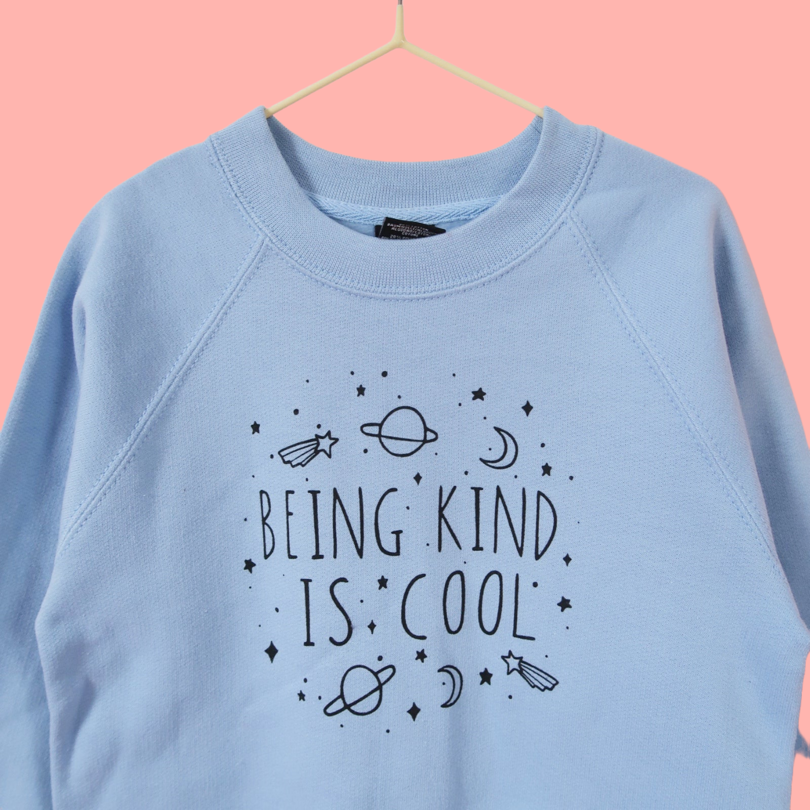 This cosy light blue kids pullover sweatshirt features my Being Kind Is Cool cosmic design on the chest, with raglan style sleeves.