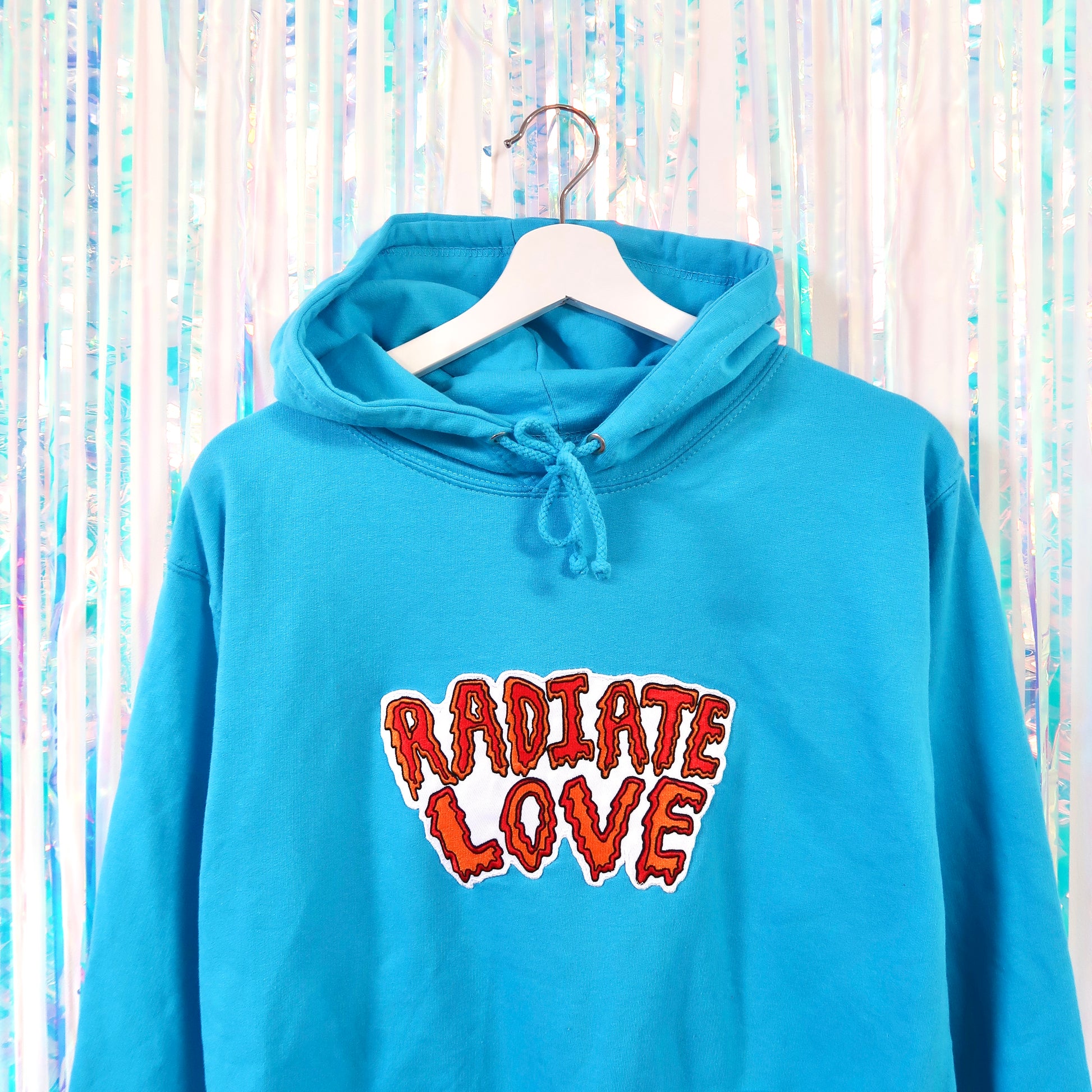 This cosy, bright blue pullover hoodie features my embroidered 'Radiate Love' design on the chest.