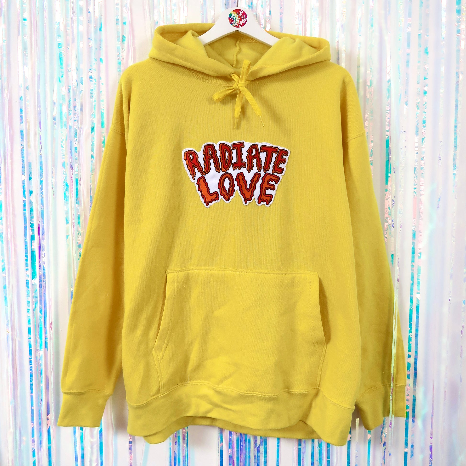 This cosy, bright yellow pullover hoodie features my embroidered 'Radiate Love' design on the chest.