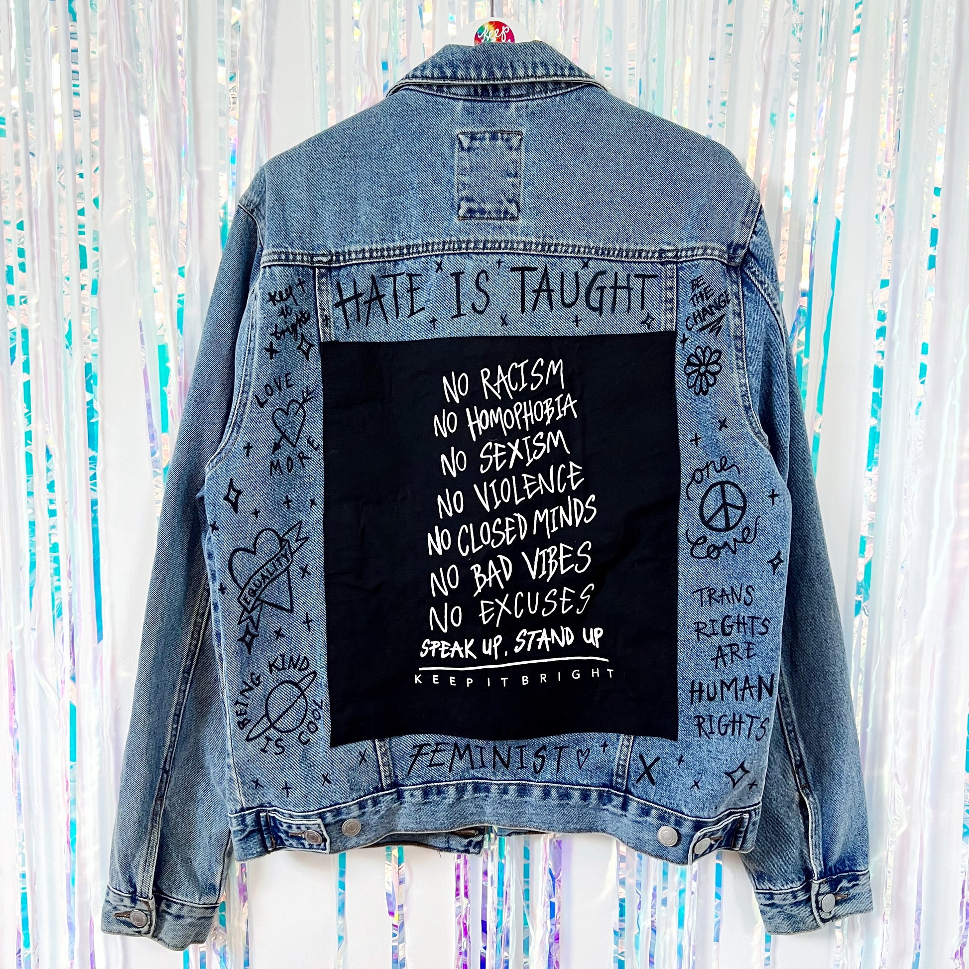 Do just that in this cool blue denim jacket, which features appliqué of my ‘No Racism, No Homophobia, No Sexism, No Violence, No Closed Minds, No Bad Vibes, No Excuses; Speak Up, Stand Up - Keep It Bright' design on the back, surrounded by hand-painted messages: ‘be the change’, ‘trans rights are human rights’, ‘feminist’, ‘being kind is cool’, ‘one love’, ‘equality’.